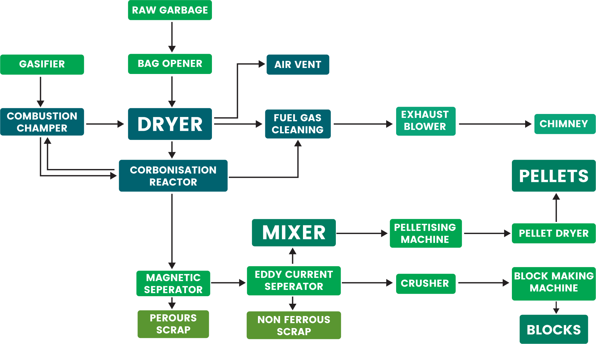Municipal Solid Waste’s Combustible Fraction (Plastic, Cloth, Rubber, Leather, Wood Waste, Paper Boards) is converted into Carbon Enriched Fuel (Coal) which is used as a heat energy source in Cement Plants, Steel Plants, Brick kilns, Ceramic Industries, Tea Factories etc. Coal with 4200 – 4500 Kcal – GCV. This makes the Process / Project Financially Viable and Successful.
