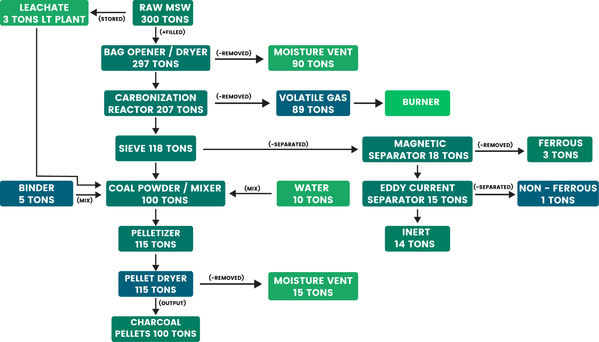Four lines of Machinery Line Assembly will be installed to process 2400 Tons of legacy waste while 2 lines of Reactors will be installed to convert combustible waste into Carbon Enriched Fuel (Coal) a fully disposable and saleable product.